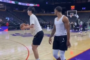 賽前,撕裂之城混音球員們進(jìn)行投籃熱身,楊瀚森三分試投2投1中。