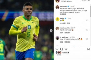 卡塞米羅社媒曬出比賽照片,寫道:“全隊(duì)都表現(xiàn)出色,距離世界杯又近了一步!加油巴西!”