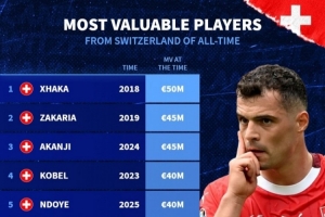 體育資訊11月16日訊 日前,德國轉會市場統(tǒng)計了瑞士球員歷史最高身價排行,扎卡5000萬歐居首。