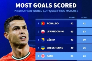 體育資訊11月17日訊 德國(guó)轉(zhuǎn)會(huì)市場(chǎng)列出了歐洲世預(yù)賽歷史射手榜,C羅41球居首,萊萬33球次席,哈蘭德21球排在第7位。