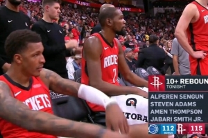 本場比賽火箭四人籃板上雙,據(jù)現(xiàn)場統(tǒng)計,這是自隊(duì)史2001年來首次。