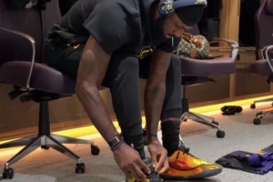 賽前,詹姆斯在更衣室哼著小曲,同時(shí)穿上了他最新一代簽名鞋“詹23”。這將是詹姆斯首次在正式比賽中穿這雙鞋。