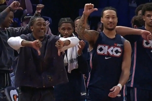 GIF-卡魯索快攻不扣籃 雷霆替補席集體弱爆了招呼