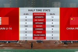 體育資訊11月22日訊 U17亞預賽第一輪,國少隊半場3-0領先巴林隊,數(shù)據(jù)方面,國少隊半場13射4正3進球,對手0射門。