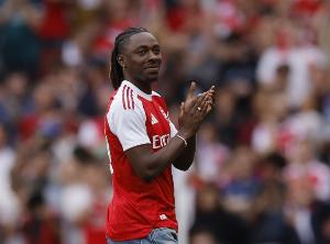 第41分鐘,槍手右路傳中被解圍,賴斯不停球直傳,埃澤面對多人防守晃開角度抽射破門。