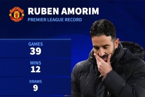 德國轉(zhuǎn)會市場統(tǒng)計(jì)了阿莫林執(zhí)教曼聯(lián)的英超數(shù)據(jù),他帶領(lǐng)曼聯(lián)參加39場英超比賽,戰(zhàn)績12勝9平18負(fù),凈勝球-10,場均拿到1.15分。