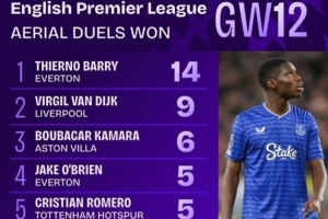 體育資訊11月25日訊 本輪英超已經(jīng)完賽,埃弗頓客場1-0力克曼聯(lián),前鋒巴里在本場表現(xiàn)出色。