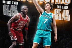 本賽季黃蜂4號秀克尼佩爾場均19.4分5.8籃板2.9助攻,三項命中率49.1、43.8、90%,真實命中率65.4%;喬丹生涯最佳單賽季真實命中率是61.4%。