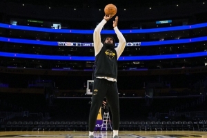 體育資訊11月26日訊 今日,湖人官推曬出一組前鋒詹姆斯的賽前熱身照。