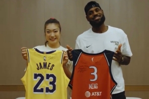詹姆斯與李夢親切交流,互贈禮物。李夢送給詹姆斯一個成都的吉祥物“花花”玩偶,詹姆斯回贈李夢簽名球衣和球鞋,兩人還互換球衣并合影。
