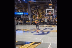 賽前熱身庫里走到中圈,他在logo處連續(xù)發(fā)射2球,全部穿網(wǎng)而過,展現(xiàn)逆天射術(shù)。