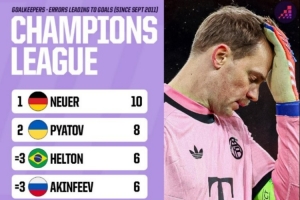 體育資訊11月27日訊 在本輪歐冠,阿森納3-1擊敗拜仁,諾伊爾出擊失誤導(dǎo)致丟球。數(shù)據(jù)網(wǎng)站OPTA也盤點(diǎn)了自2011年9月以來歐冠賽場門將因失誤導(dǎo)致丟球榜單,具體如下: