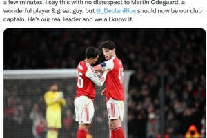 阿森納擁躉摩根在社媒曬出賴(lài)斯本場(chǎng)戴上隊(duì)長(zhǎng)袖標(biāo)的照片,寫(xiě)道:“賴(lài)斯昨晚比賽中首次戴上阿森納隊(duì)長(zhǎng)袖標(biāo),盡管只有幾分鐘。我這么說(shuō)并不是出于對(duì)厄德高的不敬,他也是一名出色的球員、很棒的伙計(jì),但是賴(lài)斯現(xiàn)在應(yīng)該成為球隊(duì)隊(duì)長(zhǎng)了,他是我們真正的領(lǐng)袖,這我們都知道的?!?/p>