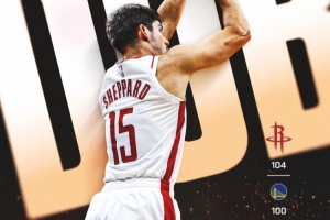 體育資訊11月27日訊 當(dāng)?shù)貢r(shí)間感恩節(jié),火箭官方曬出了戰(zhàn)勝勇士的贏球海報(bào),封面人物是謝潑德,背景字樣是“勝利(dub)”。