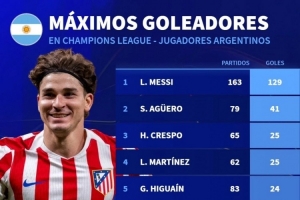 體育資訊11月28日訊 德國轉(zhuǎn)會市場統(tǒng)計了阿根廷球員在歐冠比賽中的進球數(shù)量,并列出榜單,梅西129球居首,阿圭羅次席,阿爾瓦雷斯18球第9。