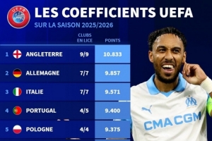 本賽季歐戰(zhàn)積分排名: