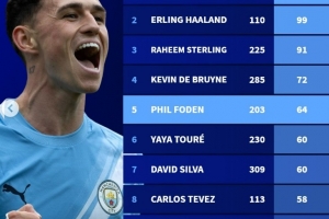 體育資訊11月30日訊 在本輪英超,曼城3-2擊敗利茲聯(lián),福登梅開(kāi)二度。以下為曼城隊(duì)史英超射手榜: