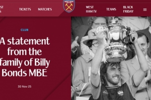西漢姆聯(lián)俱樂部懷著深切的悲痛和無比沉重的心情,發(fā)布這位傳奇球員、教練和主教練比利·邦茲MBE的家族聲明: