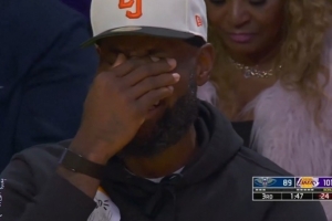 GIF-克萊伯上籃被籃筐帽了 詹姆斯在場(chǎng)邊捂臉笑不停