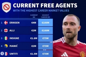 體育資訊9月7日訊 主流聯(lián)賽的夏窗已經(jīng)關(guān)閉,《轉(zhuǎn)會(huì)市場(chǎng)》統(tǒng)計(jì)了當(dāng)前仍為自由身的球員歷史身價(jià)榜,埃里克森和阿里并列居首。