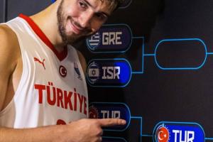 賽后在官方的晉級墻上,申京作為代表將把土耳其的隊標貼到對應的8強席位上,申京開了個小玩笑,假動作直接就想把標貼向決賽的方向,最終還是老老實實地把隊標貼到8強的位置。