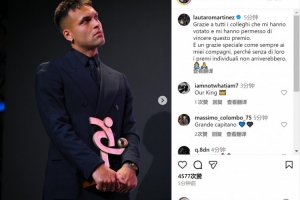 勞塔羅社媒曬出領(lǐng)獎的照片,并寫道:“感謝所有投票支持我的球員,是你們讓我獲得了這個獎項(xiàng)?!?/p>