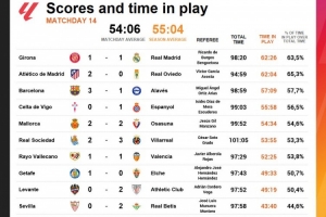 體育資訊12月2日訊 數(shù)據(jù)顯示,赫羅納1-1皇馬是第14輪西甲凈時間最長的比賽。