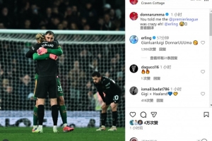 曼城門(mén)將多納魯馬社媒曬出與哈蘭德?lián)肀У恼掌?,配文:“你早就告訴過(guò)我英超很瘋狂,是吧!??”