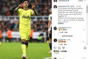 羅梅羅社媒曬出比賽照片,配文:“一切都關乎努力拼搏、不斷進步、勇往直前。尤其在當下,當事態(tài)不如意時,我們更要團結一心??”
