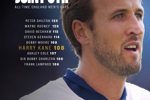 在英格蘭2-0安道爾的比賽中,凱恩迎來了在英格蘭隊的第108次出場,追平博比-摩爾,并列英格蘭隊史第5。
