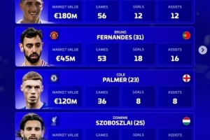 體育資訊12月4日訊 《轉(zhuǎn)會市場》評選2025年最佳前腰(攻擊型中場),并列出了4人候選同時對比了他們的數(shù)據(jù):