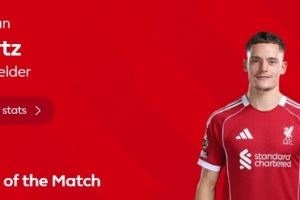 此役維爾茨踢滿全場(chǎng),并造穆基勒烏龍,為利物浦扳平比分,英超官方宣布,經(jīng)過(guò)球迷的投票,維爾茨當(dāng)選本場(chǎng)比賽最佳球員。