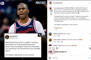在為這支表現(xiàn)不佳的球隊(duì)奉獻(xiàn)了職業(yè)生涯一半的時(shí)間后,克里斯·保羅本打算回到快船隊(duì),以一個(gè)完美的賽季結(jié)束自己的籃球生涯。然而,在賽季開(kāi)始僅一個(gè)月后,這位即將退役的老將卻在深夜被球隊(duì)“送回家”。這一舉動(dòng)引發(fā)了球迷的強(qiáng)烈不滿(mǎn),有球迷在推特上直言:“快船管理層的行為簡(jiǎn)直是犯罪?!?/p>