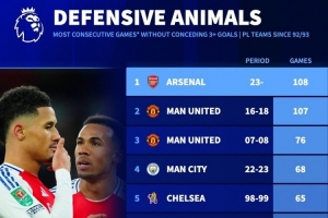 92-93賽季以來(lái)英超球隊(duì)連續(xù)失球少于3粒比賽場(chǎng)次紀(jì)錄: