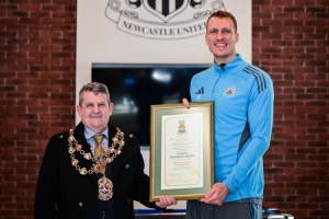 本周,布萊斯市市長戴維·斯溫霍議員前往紐卡斯?fàn)柭?lián)隊訓(xùn)練基地,為丹·伯恩頒發(fā)了這項殊榮——布萊斯市最高公民獎——以表彰他在聯(lián)賽杯決賽中為紐卡斯?fàn)柭?lián)做出的卓越貢獻(xiàn)。