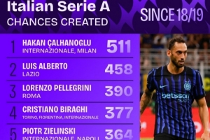 體育資訊9月7日訊 《轉(zhuǎn)會市場》統(tǒng)計了18-19賽季以來的意甲創(chuàng)造機會情況,恰爾汗奧盧獨自領跑。