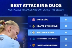 本賽季五大聯(lián)賽雙人組進(jìn)球榜: