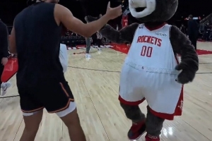 GIF-狄龍賽前和火箭主場的吉祥物打鬧