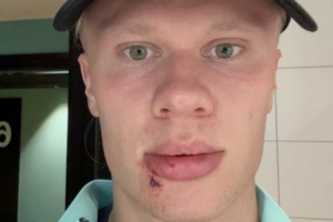 哈蘭德在今日通過社媒曬出自拍照,可以清洗看到嘴唇下的傷口,他對(duì)此解釋稱:“剛剛被公交車門給撞了??縫了三針??”