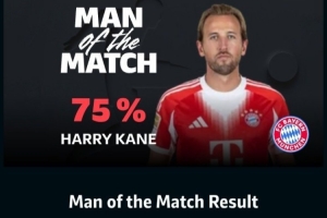本場比賽,凱恩在替補登場的情況下完成帽子戲法。以75%的票數(shù)力壓隊友萊默爾(10%)、奧利塞(6%)、斯坦尼西奇(2%)和基米希(1%)奪得全場最佳。