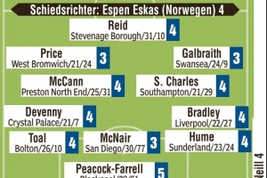 中場:德文尼(4)、麥卡恩(4)、查爾斯(4)、布拉德利(4)、艾薩克-普萊斯(3)、加爾布雷斯(3)