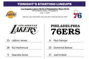 體育資訊12月8日訊 今日8點半,76人主場對陣湖人。賽前雙方公布了本場首發(fā)陣容:
