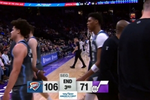 前三節(jié)比賽,場上完全呈現(xiàn)出一邊倒的局面,爵士三節(jié)過后已經(jīng)讓雷霆得分破百并落后多達(dá)35分,更為可怕的是,爵士三節(jié)拿到71分比雷霆半場結(jié)束時的74分還少3分。