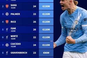體育資訊12月09日訊 今日德轉(zhuǎn)更新新一期英超球員身價,哈蘭德2億居首,伊薩克降至1.2億,維爾茨降至1.1億。