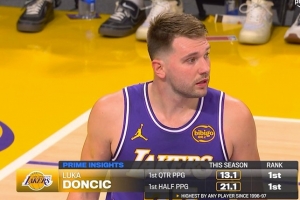 湖人VS馬刺,轉(zhuǎn)播方曬出統(tǒng)計(jì),東契奇場均首節(jié)13.1分&上半場21.1分,都是有統(tǒng)計(jì)(96-97賽季)以來的最高。
