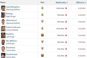 體育資訊12月12日訊 德轉(zhuǎn)更新西甲身價(jià),跌幅排行中,貝林厄姆、羅德里戈和桑塞特下跌2000萬歐最多。