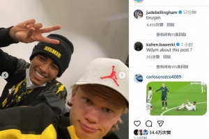 體育資訊12月13日訊 哈蘭德更新社媒,曬出自己和貝林厄姆的合照。貝林厄姆則評論回復(fù):老鐵。