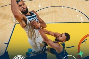 賽后森林狼發(fā)布贏球海報,封面人物為戈貝爾,背景則是在內線防守他的庫里。
