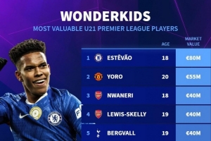 體育資訊12月13日訊 德國轉(zhuǎn)會(huì)市場列出了英超U21球員身價(jià)排名,埃斯特旺8000萬歐居首,約羅5500萬歐次席。