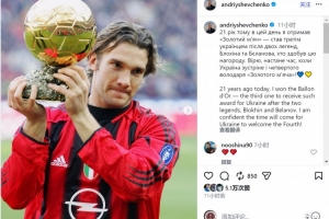 舍甫琴科社媒曬出自己與金球獎(jiǎng)杯的合照,配文:“21年前的今天,我贏得金球獎(jiǎng),成為繼布洛欣和別拉諾夫之后,第三位獲得這一獎(jiǎng)項(xiàng)的烏克蘭球員。我相信烏克蘭終會(huì)迎來(lái)第四位金球獎(jiǎng)得主!”